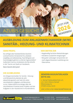 Unser Unternehmen bietet seit 1978 überdurchschnittlich abwechslungsreiche Ausbildungsplätze im Beruf des Anlagenmechanikers für Sanitär-, Heizung- und Klimatechnik an. Wir begegnen unseren Mitarbeitern auf Augenhöhe und mit dem nötigen Respekt. Wir sehen es als unsere Pflicht an, dass sich unsere Mitarbeiter regelmäßig fachlich weiterbilden.